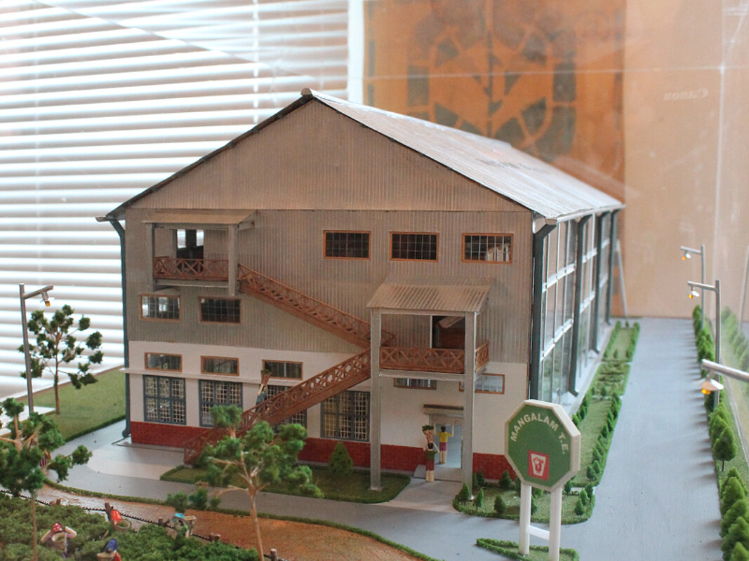 Das Modell zeigt die Teefabrik der Towkok Plantage, die sich in Nagaland, einem kleinen indischen Bundesstaat im Nordosten Indiens, befindet. Am Fuße des Berglandes von Nagaland, an den Ufern des Towkok-Flusses liegt der Teegarten „Mangalam“, der heute eine Fläche von rund 120 Hektar für den Teeanbau nutzt.